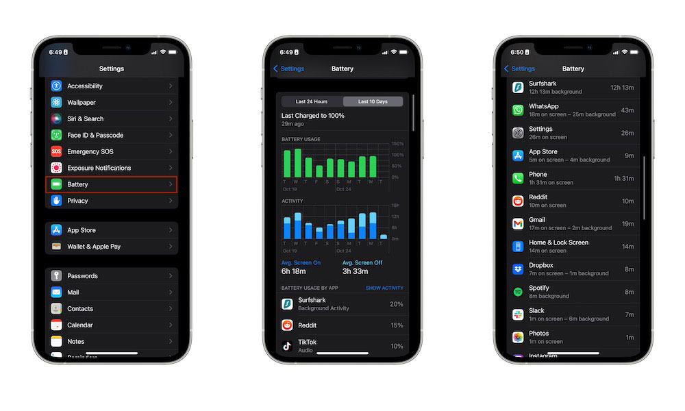 สาเหตุหนึ่งที่ทำให้แบต iPhone หมดไวผิดปกติ อาจจะเกิดจากแอปพลิเคชันที่ใช้งานอยู่ แต่ข่าวดีคือ ผู้ใช้สามารถตรวจสอบเองได้ว่า แอปฯ ไหนที่กินแบตมากจนเกินไป ด้วยการเข้าไปที่ Settings > Battery ตรงหัวข้อ Battery Usage By App ให้เช็คดูว่า แอปฯ ไหนใช้แบตมากจนเกินไป ถ้าหากเป็นแอปฯ ที่ไม่ได้ใช้งาน ให้ Force Quit เพื่อปิดการทำงานเบื้องหลัง