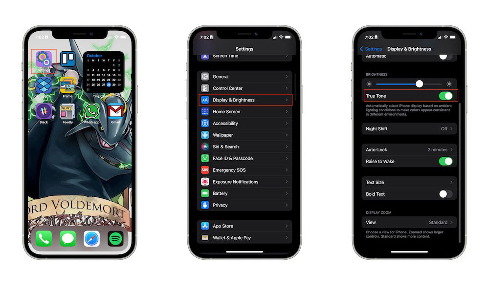 การปรับตั้งค่าความสว่างหน้าจอให้เหมาะสมกับคอนเทนต์ที่ใช้งาน จะช่วยประหยัดแบตได้อีกทางหนึ่ง ซึ่งสามารถปรับได้เลยผ่านทาง Control Center หรือเลือกปิด True Tone ด้วยการเข้าไปที่ Settings > Display & Brightness > ปิด True Tone