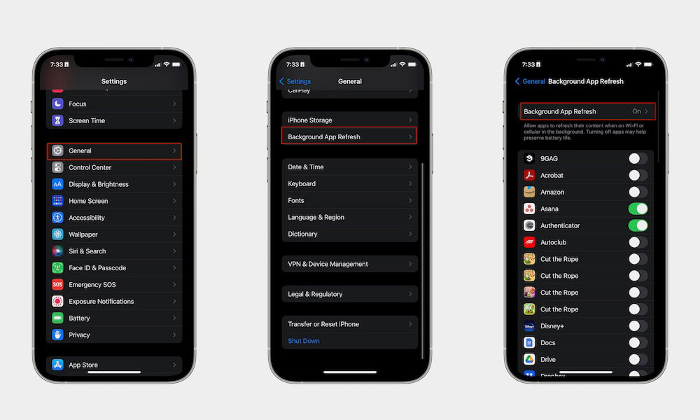 Background App Refresh เป็นโหมดการทำงานแบบเบื้องหลัง ที่จะทำการอัปเดตคอนเทนต์ใหม่ ๆ ให้อัตโนมัติโดยที่ผู้ใช้ไม่ต้องทำการรีเฟรชเอง สะดวกต่อการใช้งานก็จริง แต่ก็เปลืองแบตเช่นกัน และถ้าหากคิดว่า ฟีเจอร์ดังกล่าวไม่จำเป็น เพราะสามารถรีเฟรชข้อมูลแบบแมนนวลเองได้ ให้ปิด Background App Refresh บนแอปฯ ที่คิดว่าไม่จำเป็นต้องใช้ฟีเจอร์ดังกล่าว