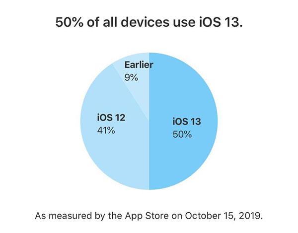 โดยข้อมูลล่าสุดจาก Apple ได้เผยสัดส่วนการอัปเดต iOS (สิ้นสุด 15 ตุลาคม 2019) พบว่า ในช่วงเวลาไม่ถึงเดือนนับจากปล่อยอัปเดต iOS 13 นั้น จำนวนผู้ใช้อุปกรณ์ iOS กว่า 50% ได้ทำการอัปเดตเป็น iOS 13 แล้ว ส่วนอีก 41% ยังคงใช้ iOS 12 และอีก 9% ใช้ iOS เวอร์ชันที่เก่ากว่า