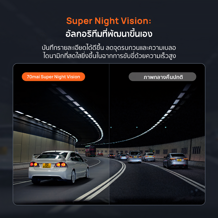 สำหรับการขับขี่ในเวลากลางคืน กล้องติดรถยนต์ 4K A800SE ยังคงมอบประสิทธิภาพที่ยอดเยี่ยมด้วยเทคโนโลยี Super Night Vision ที่ขับเคลื่อนด้วยอัลกอริธึมประมวลผลภาพที่พัฒนาขึ้นโดย 70mai และรูรับแสงขนาดใหญ่ F1.55 การปรับแต่งขั้นสูงนี้ช่วยลดสัญญาณรบกวนและประสิทธิภาพการรับแสงแม้ในสภาพแสงน้อย ด้วยรูรับแสงที่กว้างขึ้นสามารถรับแสงได้มากกว่ารุ่นทั่วไปถึง 78% เมื่อเทียบกับเลนส์ F2.0 ทำให้ได้ภาพที่คมชัด สีสันสดใส และแม่นยำ แม้ในคืนที่มืดหรือฝนตก