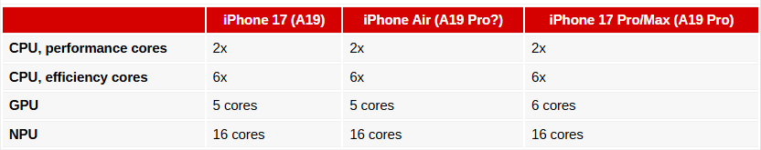 จากข้อมูลข้างต้น จะเห็นว่า ชิปเซ็ต A19 บน iPhone 17 กับชิปเซ็ต A19 Pro บน iPhone Air รายละเอียดแทบไม่ต่างกัน แม้ว่า Apple จะไม่มีข้อมูลเกี่ยวกับหน่วยความจำ RAM ออกมา แต่ iPhone Air จะมาพร้อมกับ RAM 12GB เท่า iPhone 17 Pro ในขณะที่ iPhone 17 จะมาพร้อมกับ RAM 8GB ซึ่งคงต้องรอผลการทดสอบประสิทธิภาพอีกทีว่า iPhone Air ต่างจาก iPhone รุ่นอื่นแค่ไหน