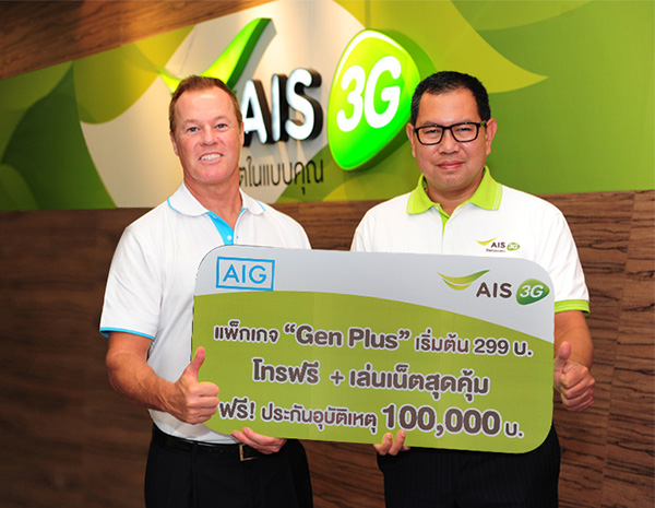 เอไอเอส 3G รายเดือน โดย คุณฐิติพงศ์ เขียวไพศาล ผู้ช่วยกรรมการผู้อำนวยการอาวุโส สายงานการตลาดและการขาย จับมือมร. โรนัลด์ เอ. ฮิวดอน ผู้จัดการสำนักงานประเทศไทย และประธานคณะผู้บริหาร บริษัท นิวแฮมพ์เชอร์ อินชัวรันส์ สาขาประเทศไทย ประธานกลุ่มบริษัท เอไอจี ประเทศไทย เดินหน้ามอบอีกแพ็กเกจดีๆ ที่เข้าใจ ให้ลูกค้าที่เปิดเบอร์ใหม่ หรือย้ายค่ายมาเป็นเอไอเอส 3G รายเดือน ด้วยแพ็กเกจใหม่ “Gen Plus” (Generation Plus) ที่เหมาะสำหรับผู้ที่มีอายุ 40 ปีขึ้นไป ให้ได้รับความคุ้มค่า ทั้งโทรสุดคุ้ม และเล่นเน็ตได้แบบไม่ต้องกังวล โดยระบบจะปรับเข้าแพ็กสุดคุ้มโดยอัตโนมัติ ในราคาเริ่มต้นเพียง 299 บาท/เดือน โทรฟรีทุกเครือข่าย 260 นาที และ 399 บาท/เดือน โทรฟรีทุกเครือข่าย 400 นาที