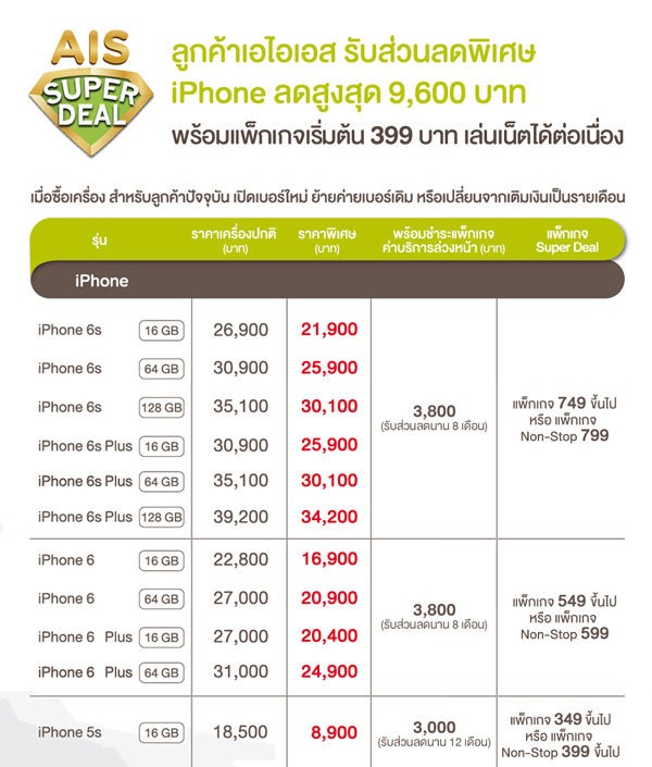 ส่วนรุ่นอื่นๆ ก็จัดโปรโมชั่น ลดราคาด้วยเช่นเดียวกัน ไม่ว่าจะเป็น iPhone 6 เริ่มต้นที่ 16,900 บาท, iPhone 6 Plus เริ่มต้นที่ 20,400 บาท เพียงแค่สมัครแพ็กเกจ และจ่ายค่าบริการล่วงหน้า ซึ่งส่วนที่ต้องจ่ายล่วงหน้านี้ จะเป็นส่วนลดค่าบริการตลอดรอบบิลด้วย