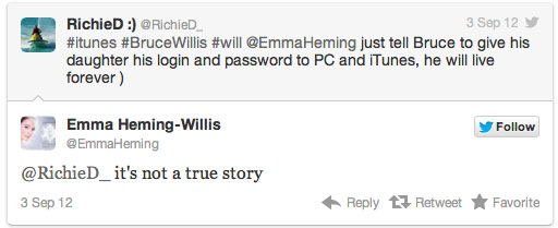 ซึ่งเรื่องนี้ ได้มีผู้หวังดี ทวีตข้อความไปบอก Emma Heming-Willis ภรรยาคนสวยของบรูซว่า ปัญหาเรื่องนี้แก้ได้ง่ายๆ แค่ให้บรูซ วิลลิส บอก Username และ Password ให้กับลูกสาว เพื่อเข้าไปล็อกอินใช้งานแทน ซึ่งทาง Emma Heming-Willis ได้ทวีตข้อความกลับ ปฏิเสธว่า ข่าวการฟ้อง Apple นั้น ไม่ใช่เรื่องจริงครับ