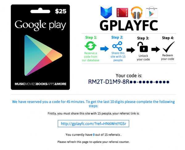 โดยเว็บไซต์ whatphone รายงานว่า หน้าตาของเว็บ GPLAYFC นั้น จะคล้ายๆ กับหน้าเว็บไซต์ของ กูเกิล ประหนึ่งว่า เป็นกูเกิลสร้างขึ้นมาเอง แต่จริงๆ แล้วไม่ใช่ครับ โดยเมื่อเข้าหน้าหลัก จะมีขั้นตอนทั้งหมด 4 ขั้นตอนให้ทำตาม เพื่อรับ code และได้ Google Play Gift Card มูลค่า $25 ไปฟรีๆ หลักการง่ายๆ ก็คือ ให้แชร์ลิงค์ผ่าน Facebook ให้ครบ 15 คน เมื่อแชร์ครบ จะทำการปลดล็อคและสุ่ม code ให้เรา ซึ่งหลังจากทดสอบแล้วพบว่า code ดังกล่าว ไม่สามารถใช้ได้ และไม่มีการแจก Google Play Gift Card ตามที่กล่าวอ้างครับ