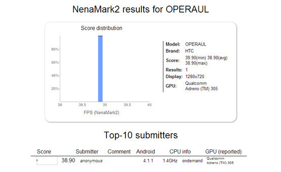 นอกจากนี้ ยังมีข้อมูล benchmark จาก NenaMark2 หลุดออกมา เผยให้เห็นสเปคบางส่วนด้วย นั่นก็คือ HTC Opera UL นั้น น่าจะใช้ซีพียู ที่คาดว่า เป็น Dual-core processor ความเร็ว 1.4GHz, ระบบประมวลผลภาพ Adreno 305 และหน้าจอความละเอียดระดับ HD ครับ นอกจากนี้ ยังรันด้วยระบบปฏิบัติการ Android 4.1.1 Jelly Bean อีกด้วย