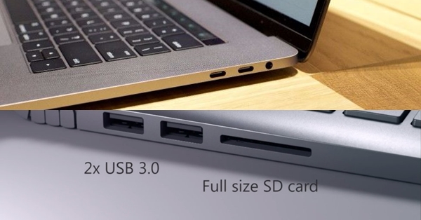 MacBook Pro (2016) รุ่นกลางมาพร้อม Touchbar ติดตั้งพอร์ตเชื่อมต่อแบบ Thunderbolt 3 (USB-C) มาให้ทั้งหมด 4 พอร์ต ด้วยกันทำให้เราสามารถถ่ายโอนข้อมูล, ส่งสัญญาณภาพ และที่สำคัญที่สุดคือสามารถชาร์ตแบตเตอรี่ที่พอร์ตไหนก็ได้ นอกจากนี้ยังติดตั้งช่องหูฟังขนาด 3.5 มิลลิเมตรมาให้ด้วย ส่วน Surface Book มีพอร์ตเชื่อมต่อบแบบ USB 3.0 ทั้งหมด 2 พอร์ต, พอร์ตสำหรับเชื่อมต่อ SD Card , พอร์ต Surface Connect สำหรับเชื่อมต่ออุปกรณ์เสริม, พอร์ต Mini Display และช่องเสียบหูฟังขนาด 3.5 มิลลิเมตร