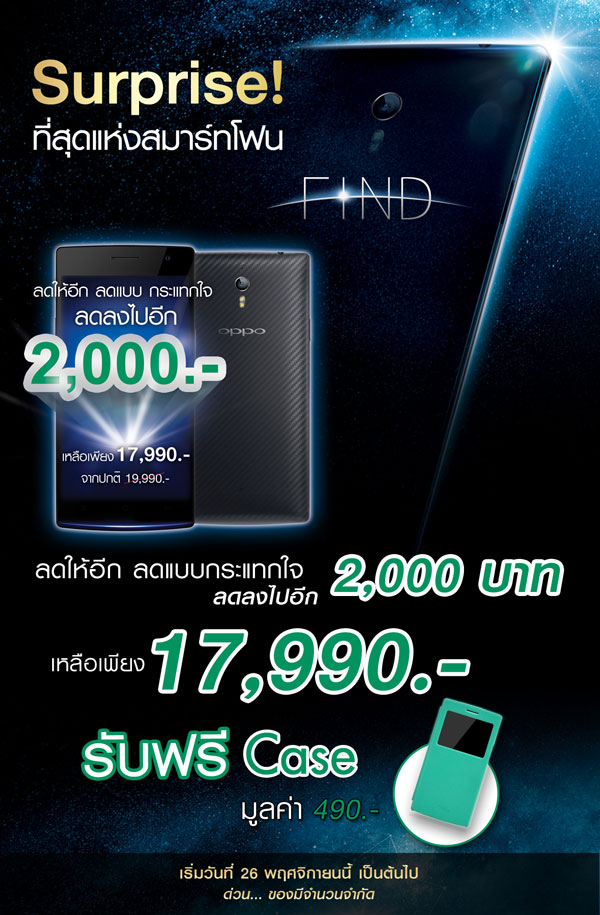 โปรโมชั่นแรงๆ ส่งท้ายปีเก่ากับการหั่นราคา OPPO Find 7 สมาร์ทโฟนรุ่นท็อปตัวแรง จากเดิมที่ราคา 19,990 บาท ลงมาอยู่ที่ 17,990 บาทเท่านั้น พร้อมรับฟรีเคสสวยๆ ตรงรุ่นมูลค่า 490 บาท (เคสมีจำนวนจำกัด แจกจนกว่าของจะหมด) หาซื้อ OPPO Find 7 ได้แล้ววันนี้จาก OPPO Brand Shop ทุกสาขา รวมถึงทุกช่องทางจำหน่ายทั่วประเทศ