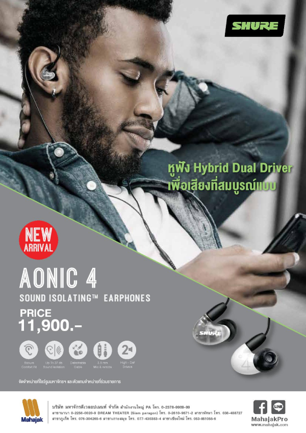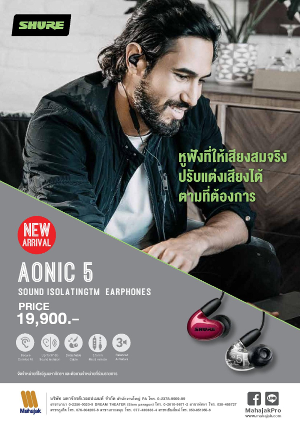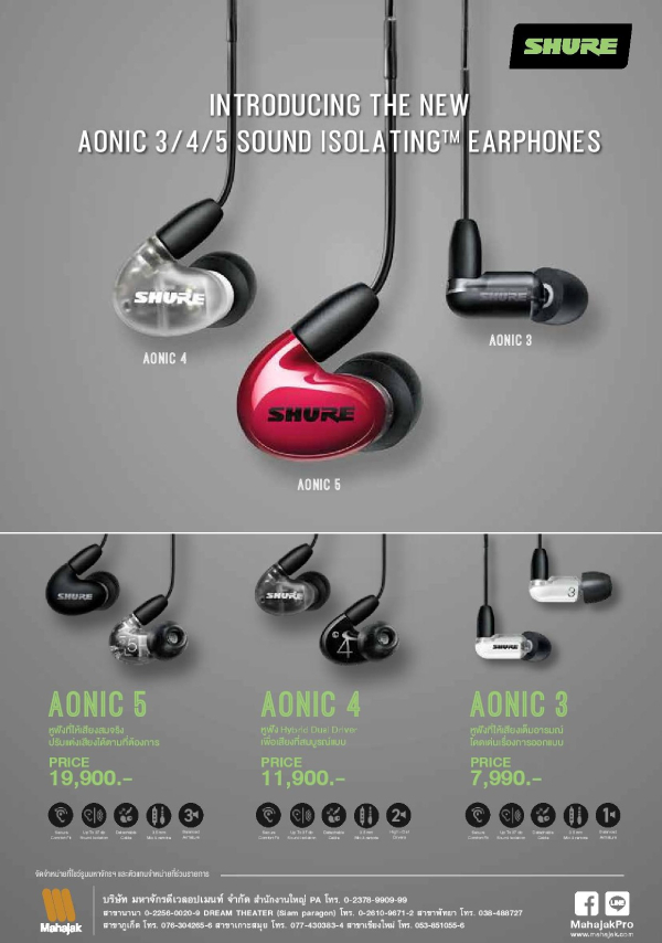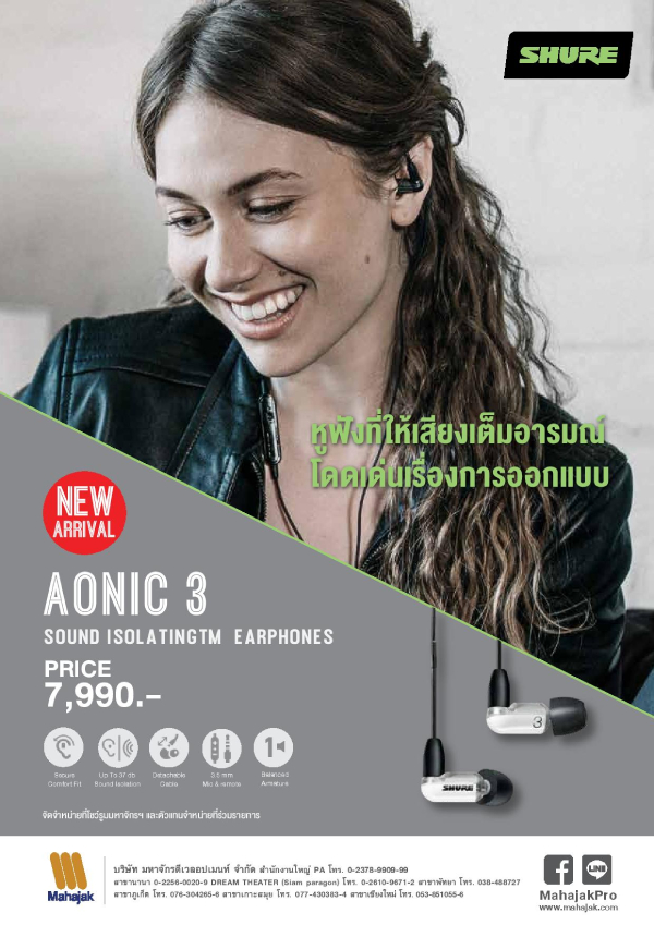 เปิดตัวครั้งแรกในไทยและพร้อมจำหน่ายแล้ว สำหรับหูฟัง IEM รุ่นใหม่ล่าสุดจากแบรนด์ SHURE ได้แก่ SHURE AONIC 3, SHURE AONIC 4 และ SHURE AONIC 5 เป็นหูฟังที่ออกแบบพิเศษมาเพื่อความสบายในการสวมใส่ ไม่เจ็บหู ทำให้คุณเพลิดเพลินกับการฟังเพลง ด้วยคุณภาพเสียงที่โดดเด่นสามารถแยกรายละเอียดเสียงได้อย่างชัดเจน และมาพร้อมระบบตัดเสียงรบกวนรอบข้าง คุณภาพเสียงที่ดีและการออกแบบอย่างมืออาชีพ แต่ละรุ่นมีรายละเอียดดังต่อไปนี้