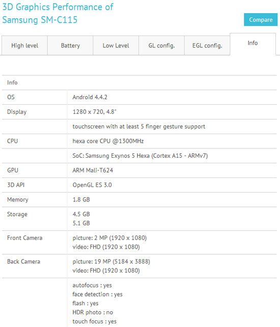 โดยข้อมูลดังกล่าว มาจากเว็บไซต์ GFXBench ซึ่งได้เผยถึงสเปคของ Samsung Galaxy S5 Zoom ไว้ดังนี้