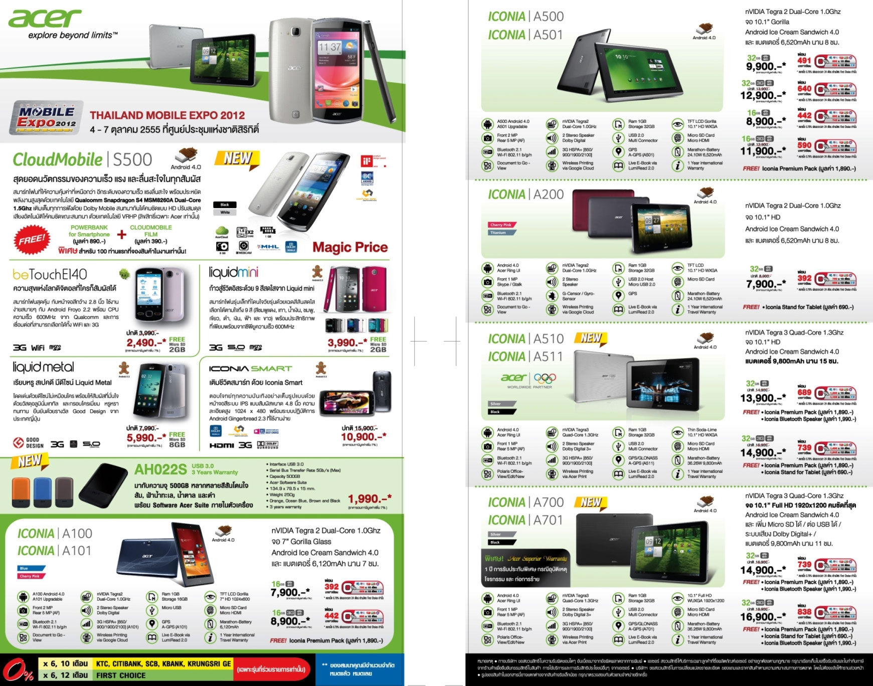 - Acer ICONIA TAB A700 / A701 เร็ว แรง คมชัดกว่าใครด้วยหน้าจอ Ultra Display 10.1” Full HD WUXGA 1920x1200 ให้มุมมองกว้าง 178 องศา สมจริงทุกอณูด้วย Geforce GPU พร้อมให้ท่องโลกออนไลน์ไม่จำกัดด้วยการรองรับ Wi-Fi 802.11 b/g/n (ในรุ่น A700) และออนไลน์ไม่ขาดตอนด้วยการรองรับเทคโนโลยี 3G (ในรุ่น A701) แรงล้ำพร้อมรองรับการทำงานแบบ Multitasking ด้วย NVIDIA® Tegra™ 3 CPU Quad-Core 1.3 GHz หน่วยจัดเก็บข้อมูล 32 GB. ตอบรับทุกการเชื่อมต่อด้วยพอร์ท USB 2.0 / Micro SD / HDMI. พร้อมกล้องหน้าระดับ HD, กล้องหลังความละเอียด 5 MP. แบตเตอรี่ความจุขนาด 9800 mAh เต็มที่กับทุกประสบการณ์ความบันเทิงได้อย่างต่อเนื่องสูงสุดถึง 11 ชม. พร้อมให้เลือกสองสีสุดคลาสสิค สีดำ และสีเงิน Acer ICONIA TAB A700 พิเศษด้วยราคา 14,900 บาท และ A701 ราคา 16,900 บาท (รวมภาษีมูลค่าเพิ่ม) ฟรี! ICONIA Bluetooth Speaker มูลค่า 1,990 บาท, ICONIA Premium Pack มูลค่า 1,890 บาท และ ICONIA Stand for Tablet มูลค่า 690 บาท และพิเศษด้วย Acer Superior Warranty 1 ปี