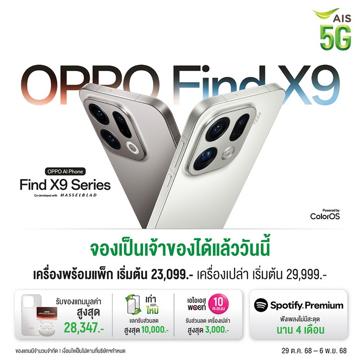 พร้อมข้อเสนอและราคาสุดพิเศษสำหรับ OPPO Find X9 Series ทั้งซื้อเครื่องพร้อมแพ็กเกจรับส่วนลดสูงสุด 10,000 บาท หรือ ใช้เอไอเอสพอยท์ 10 คะแนน แลกรับส่วนลดสูงสุด 3,000 บาท เมื่อซื้อเครื่องเปล่าไม่ติดสัญญา นอกจากนี้ยังสามารถนำมือถือเครื่องเก่ามาแลกเครื่องใหม่เพื่อรับส่วนลดสูงสุด 10,000 บาท พร้อมรับของแถมพรีเมียมและประกันหน้าจอแตกจาก OPPO Care 1 ครั้ง ภายใน 1 ปี มูลค่าสูงสุดรวม 28,347 บาท