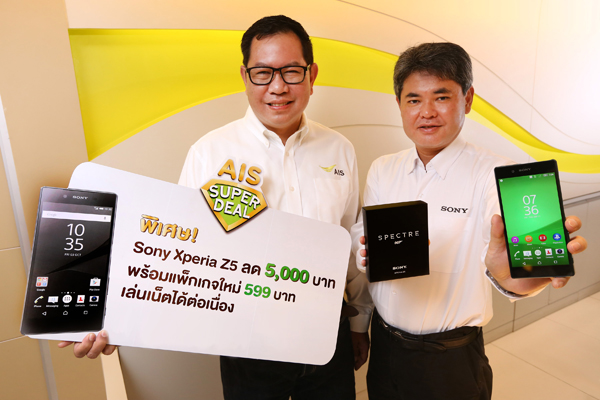 (28 ต.ค. 58)นายฐิติพงศ์ เขียวไพศาล ผู้ช่วยกรรมการผู้อำนวยการอาวุโส สายงานการตลาด เอไอเอส จับมือ มร. ยูโซะ ชิบะ กรรมการผู้จัดการ โซนี่ ไทย จำกัด นำนวัตกรรมสุดล้ำ “Sony Xperia Z5” สมาร์ทโฟนซึ่งมีกล้องที่ดีที่สุด “The world’s best camera in a smartphone” ร่วมแคมเปญ “AIS Super Deal” สำหรับลูกค้าเอไอเอสทั้งปัจจุบัน, เปิดเบอร์ใหม่, ย้ายค่ายเบอร์เดิม หรือเปลี่ยนจากเติมเงินเป็นรายเดือน เมื่อซื้อ “Sony Xperia Z5” รับส่วนลดค่าเครื่องทันที 5,000 บาท เหลือเพียง 19,990 บาท (ราคาปกติ 24,990 บาท) เพียงสมัครแพ็กเกจรายเดือน “AIS Super Deal” เริ่มต้น 599 บาท/เดือน เล่นเน็ตได้ต่อเนื่อง พร้อมชำระค่าบริการล่วงหน้า 3,800 บาท (คืนเป็นส่วนลดค่าบริการรายเดือนนาน 8 เดือน)