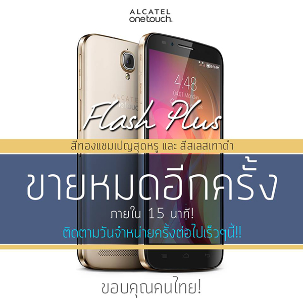 กลายเป็นรุ่นฮอตฮิตกระแสแรงของตลาดสมาร์ทโฟน 4G ไปแล้วสำหรับอัลคาเทล วันทัช แฟลช พลัส เพราะเป็นรุ่นที่ทำออกมาได้เยี่ยมทั้งสเปคและฟีเจอร์ในตัวเครื่อง คุ้มค่ากับราคาเพียง 4,690 บาท แถมยังทำโปรโมชั่นกับทาง AIS One-2-Call ด้วย แต่ขายแบบ Exclusive กับทาง Lazada เท่านั้น ซึ่งขายดีเกินคาดหมดอย่างรวดเร็ว ล่าสุด แฟลช พลัส เร่งปั๊มสินค้า นำเข้าล็อตสุดท้ายมาพร้อมจำหน่ายแบบ Flash Sale ผ่าน Lazada เพิ่มอีกทั้ง 2 สีคือ สีทอง (Gold) และสีเทาดำ (Slate) ในราคาเดิม โปรโมชั่นเดิม ใครสนใจก็อย่าพลาดกันเลยทีเดียว วันพรุ่งนี้ (พุธที่ 19 สิงหาคม 2558) เวลา 10.00-12.00 น. หรือใครพลาดบ่อยๆ ให้ลงทะเบียนเพื่อให้แจ้งเตือนที่ https://www.lazada.co.th/alcatel-flash-plus งานนี้บอกเลยไม่ควรพลาดเพราะข่าวแว่วๆว่าล็อตที่นำเข้ามาจำหน่ายนี้เป็นล็อตสุดท้ายแล้วอย่างแน่นอน