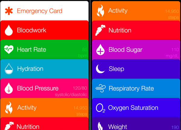 โดยจากภาพ จะเห็นได้ว่า Healthbook นั้น จะมีลักษณะคล้ายกับ แอพพลิเคชั่น Passbook เลยนั่นเองครับ ซึ่งจะมีการแบ่งแยกหมวดหมู่ ด้วยการใช้สีแยกความแตกต่าง และสามารถจัดเรียงลำดับความสำคัญได้เอง
