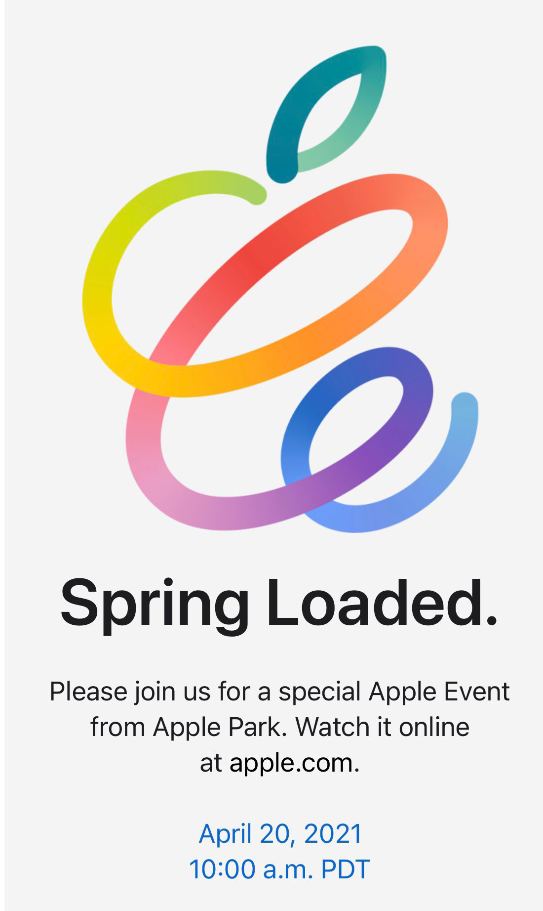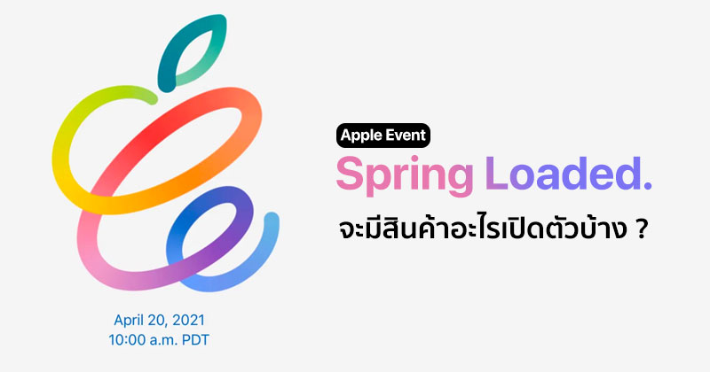 ในวันพรุ่งนี้ (20 เมษายน 2021) Apple จะมีงานอีเวนท์ในชื่อ Spring Loaded ซึ่งจะเป็นงานเปิดตัวผลิตภัณฑ์ใหม่ และงานในรูปแบบออนไลน์ โดยงานจะเริ่มในเวลา 10.00 น. ตามเวลาท้องถิ่น หรือตรงกับช่วงเที่ยงคืนของวันที่ 21 เมษายน 2021 ตามเวลาในประเทศไทย