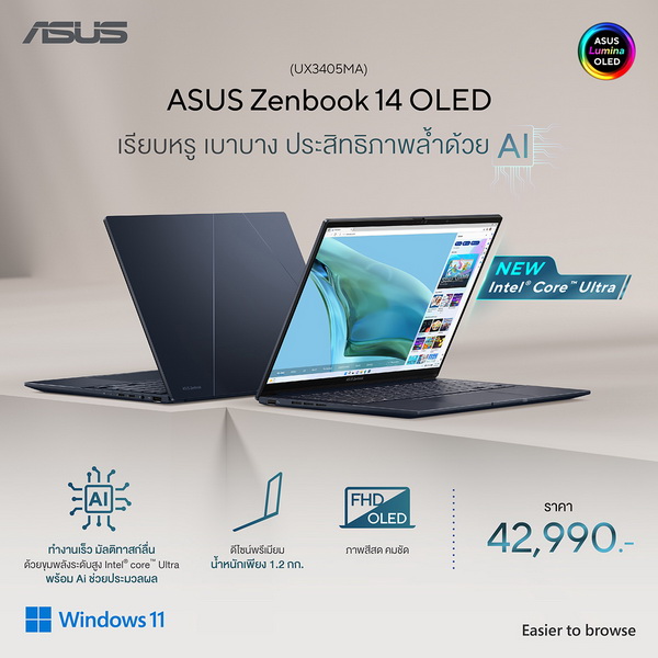 Zenbook 14 OLED (UX3405MA-QD770WS,Ponder Blue) ราคา 42,990 บาท: Intel® Core™ Ultra 7 Processor 155H/16 GB LPDDR5X (on board)/Intel® Arc™ Graphics/Intel® Evo™ Platform/14” Full HD ASUS Lumina OLED, 600 nits peak brightness with VESA Certified HDR True Black 600, 100% DCI-P3/1TB M.2 PCIe® 4.0 SSD/Wi-Fi 6E (802.11ax) with Bluetooth 5.3/75WHrs battery/1.22 kg weight/Windows 11 Home with Microsoft Office Home & Student 2021/ASUS Exclusive Care, 3 years on-site service with 1st year perfect warranty
