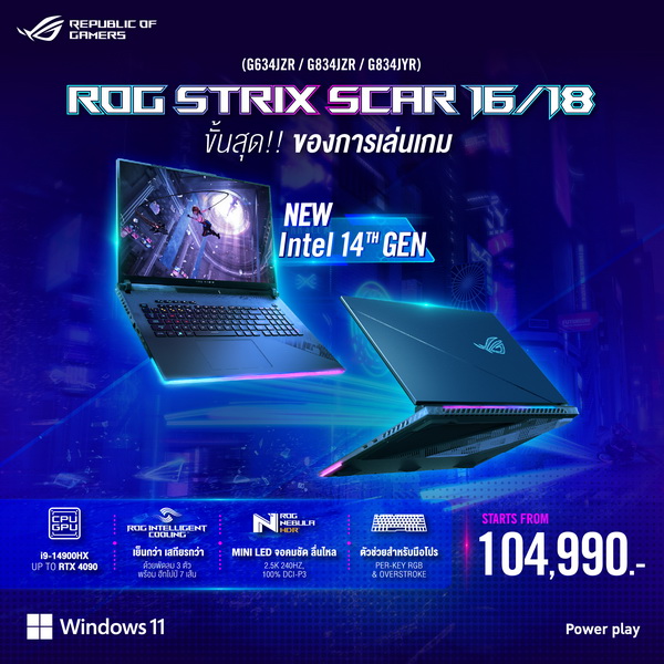 ROG Strix Scar 16 2024 (G634JZR-RA040W) ราคา 104,990 บาท: 14th Gen Intel® Core™ i9 - 14900HX Processor/32GB DDR5 5600MHz/NVIDIA® GeForce RTX™ 4080 12GB GDDR6 (175W)/16” Mini LED 16:10 2.5K ROG Nebula HDR Display 240Hz, G-Sync, 100% DCI-P3 with Pantone Validated, Dolby Vision HDR with 1,100 nits peak brightness/ 1TB M.2 PCIe® 4.0 SSD/Wi-Fi 6E (802.11ax) with Bluetooth 5.3/90WHrs battery/2.65 kg weight/Windows 11 Home/ASUS Exclusive Care, 3 years on-site service with 1st year perfect warranty