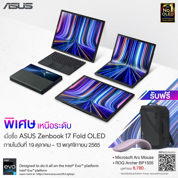 พิเศษ! เมื่อสั่งซื้อ ASUS Zenbook 17 Fold OLED ภายในวันที่ 19 ตุลาคม 2565 - 13 พฤศจิกายน 2565 ลงทะเบียนรับฟรี* Microsoft Arc Mouse และ ROG Archer BP1505 มูลค่ารวม 6,780 บาท ที่ https://th.asus.click/WmBrir