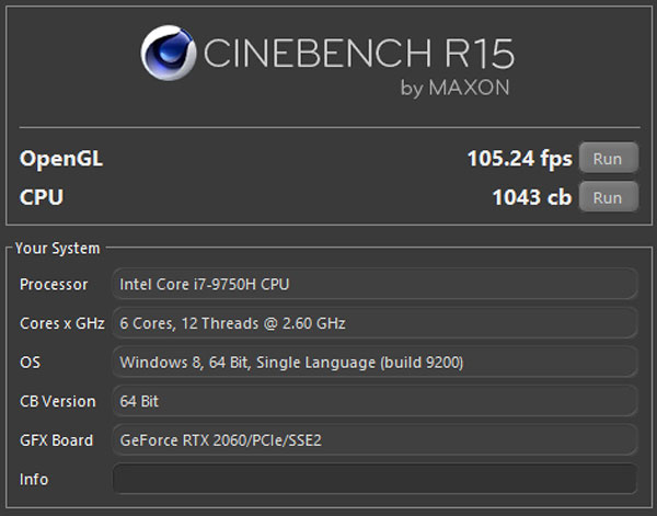 ทดสอบประสิทธิภาพในการประมวลผลของซีพียูด้วยโปรแกรม CINEBENCH R15 พบว่าทำคะแนนได้ 105.24 fps และ 1,043 cb เรียกได้ว่าเป็นคะแนนทดสอบที่น่าประทับใจ และตอบโจทย์การทำงานที่ต้องใช้การประมวลผลหนัก ๆ ได้อย่างสบาย ๆ อีกเช่นกัน