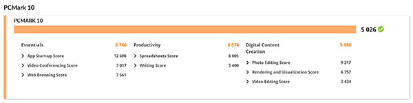 ส่วนการทดสอบประสิทธิภาพด้วยโปรแกรม PCMark 10 สามารถทำคะแนนการทดสอบรวมได้ถึง 5,026 คะแนน ซึ่งการใช้งานทั่วไปถือว่าสอบผ่าน ทั้งในส่วนของงานเอกสาร, เล่นเว็บไซต์, ตกแต่งรูปภาพ และอื่น ๆ รวมถึงงานตัดต่อวิดีโออีกด้วย