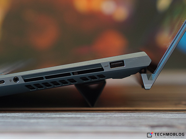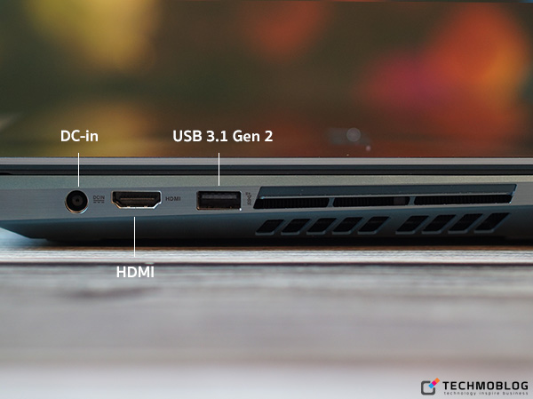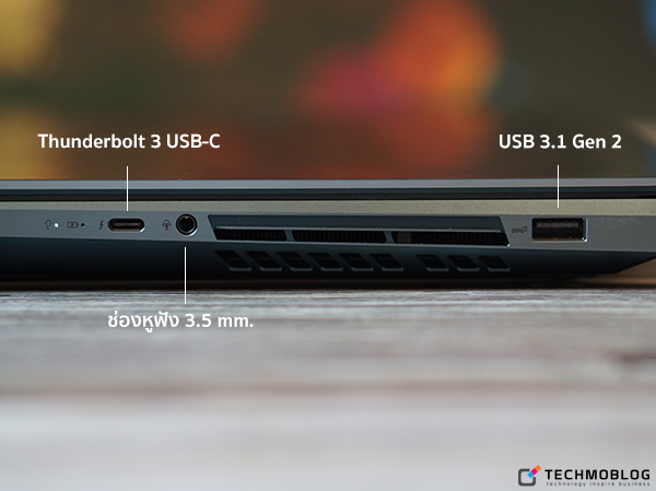 ด้านพอร์ตการเชื่อมต่อนั้นก็ถือว่ามีให้ครบครันเช่นกัน โดยด้านขวาของตัวเครื่อง ประกอบด้วย พอร์ต Thunderbolt 3 USB-C, ช่องหูฟังขนาด 3.5 มิลลิเมตร และพอร์ต USB 3.1 Gen 2 ส่วนด้านซ้ายตัวเครื่อง ประกอบด้วยช่องเสียบ Adapter, พอร์ต HDMI และพอร์ต USB 3.1 Gen 2 ด้านช่องระบายความร้อนนั้นอยู่ทั้ง 2 ด้านซ้ายและขวา