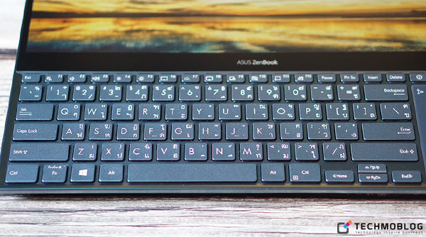 เนื่องจากหน้าจอ ScreenPad Plus กินพื้นที่ด้านล่างตัวเครื่องครึ่งหนึ่ง ทำให้ชุดแป้นคีย์บอร์ดต้องเลื่อนมาชิดขอบล่างแทน ซึ่งแป้นพิมพ์นั้นเป็นแบบ Full-Size พร้อมไฟ LED-Backlit สำหรับใช้งานในที่แสงน้อยหรือตอนกลางคืน ปรับได้ 3 ระดับ โดยมี Travel Key ที่ 1.4 mm. และมีระยะห่างระหว่างปุ่มที่พอดี สัมผัสนุ่ม ทำให้พิมพ์ได้สะดวกและสบายมือ ไม่ต้องกดแรง