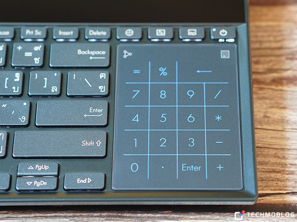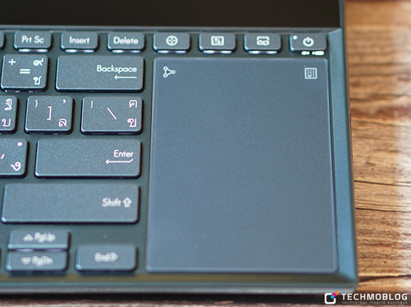 ด้าน TouchPad จะอยู่ฝั่งขวาของคีย์บอร์ด และสามารถเปลี่ยนเป็น NumPad ได้ด้วยการกดที่ไอคอนมุมบนขวา โดย TouchPad บน ASUS ZenBook Pro Duo UX581 มีขนาดที่เล็กกว่าโน้ตบุ๊คทั่วไป เนื่องจากต้องสละพื้นที่บางส่วนให้กับหน้าจอ ScreenPad Plus นั่นเอง ทำให้การใช้งานในเบื้องต้นไม่ค่อยชินมือเท่าใดนัก (ใช้เมาส์จะสะดวกมากกว่า)