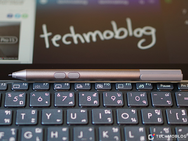 นอกจาก Palm Rest แล้ว ในชุดจำหน่ายมาตรฐานยังได้มีการแถมปากกา Stylus สำหรับใช้งานด้านการขีดเขียนหรือวาดภาพมาให้ด้วยเช่นกัน ซึ่งตัวปากกานั้น สามารถใช้งานกับหน้าจอ ScreenPad Plus ได้อีกด้วย