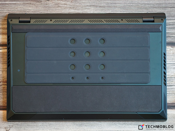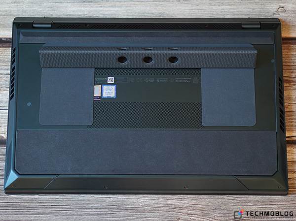 นอกเหนือจากบานพับแบบ ErgoLift แล้ว ความพิเศษของโน้ตบุ๊ครุ่นนี้ก็คือ มีแท่นรองตัวเครื่องที่สามารถพับเก็บได้ ซึ่งแท่นรองนี้สามารถพับเพื่อยกตัวเครื่องให้สูงขึ้นเพื่อระบายความร้อน โดยรุ่นนี้จะมีช่องระบายความร้อนทั้งหมด 3 ช่องด้วยกัน นั่นก็คือ ฝั่งซ้าย-ขวาของตัวเครื่อง กับซ่อนใต้หน้าจอ ซึ่งแท่นรองตัวเครื่องนี้ถูกออกแบบมาไม่ให้บังช่องระบายความร้อนที่ด้านล่างตัวเครื่องด้วยเช่นกัน (แถมมาให้ในชุดจำหน่ายมาตรฐาน)