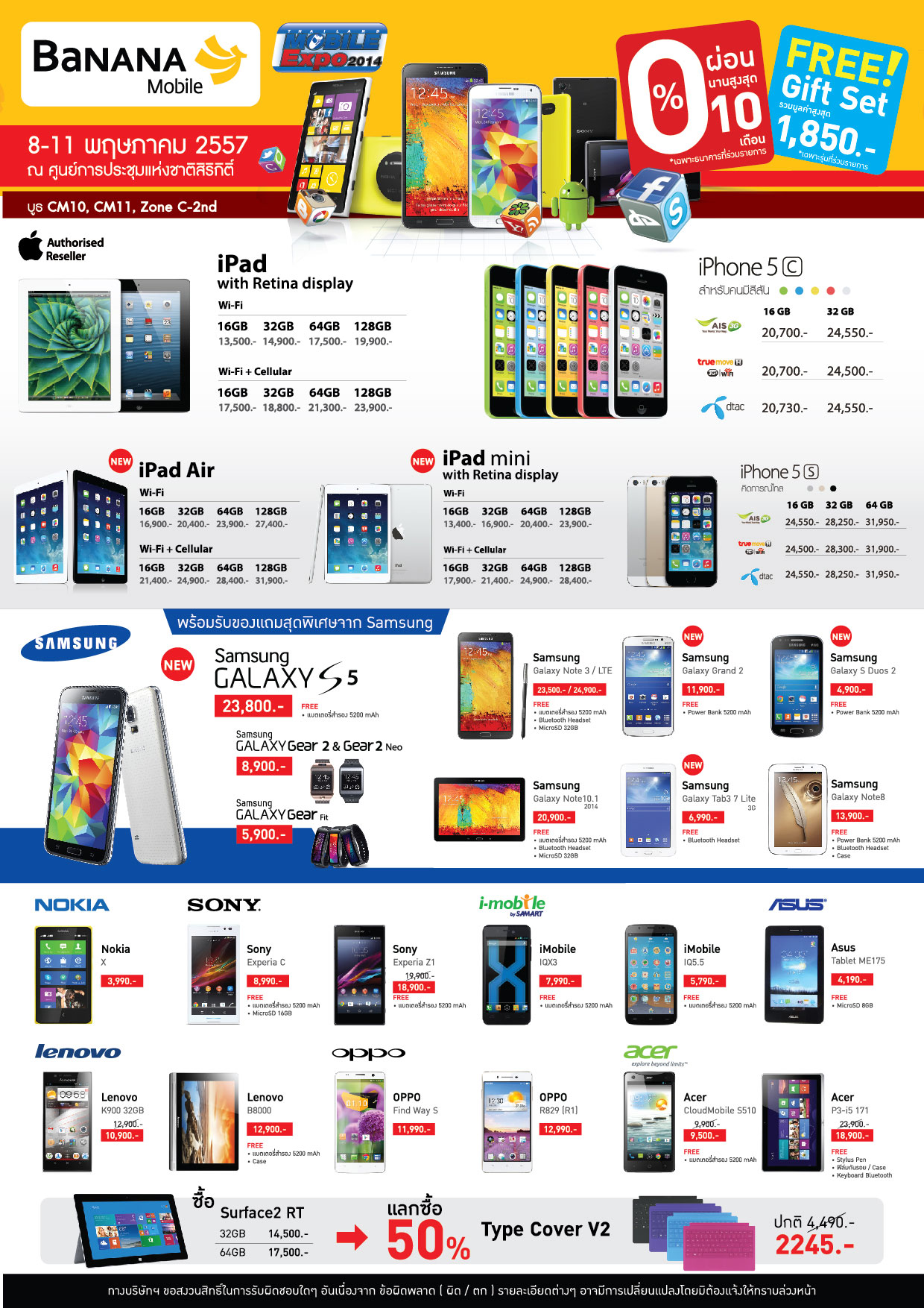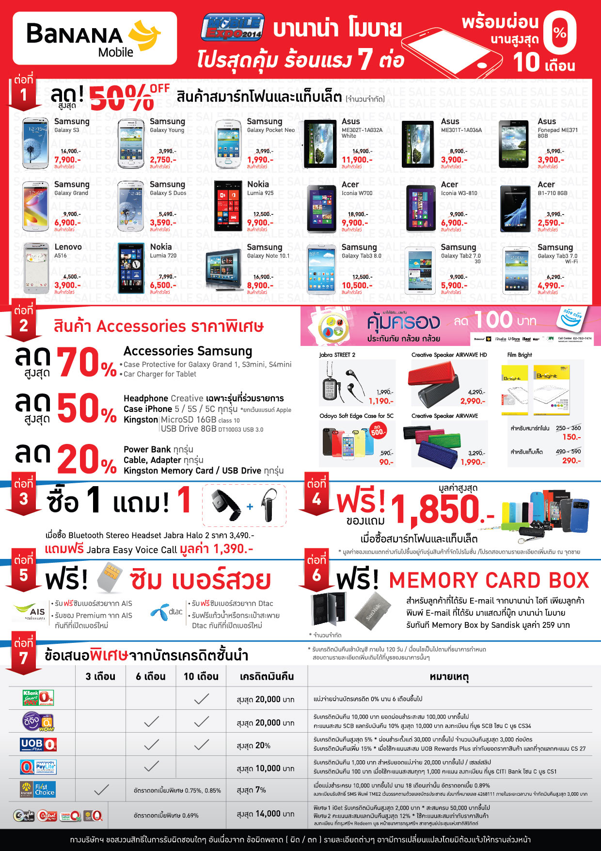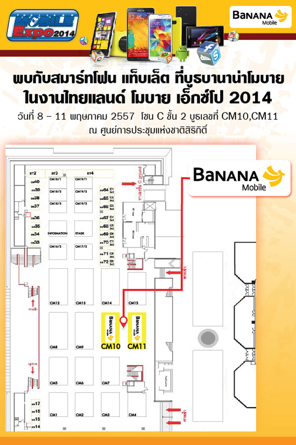 ห้ามพลาดกับโอกาสดีๆที่คุณจะได้เป็นเจ้าของสมาร์ทโฟนและแท็บเล็ตในราคาสุดคุ้มค่า มากกว่าใคร เฉพาะที่บูธบานาน่าโมบาย โซน C ชั้น 2 บูทเลขที่ CM 10, CM 11 ในงาน ไทยแลนด์ โมบาย เอ๊กซ์โป 2014 ระหว่างวันที่ 8-11 พฤษภาคม 2557 ที่ศูนย์ประชุมแห่งชาติสิริกิติ์