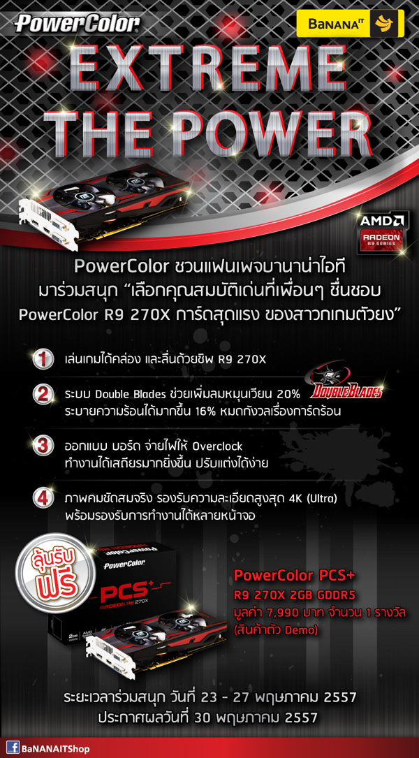 ร่วมสนุกกิจกรรม Facebook BaNANAIT พร้อมลุ้นรับของรางวัล PowerColor PCS+ R9 270X 2GB GDDR5 จำนวน 1 รางวัล มูลค่ากว่า 7,990 บาท (สินค้าตัว Demo)