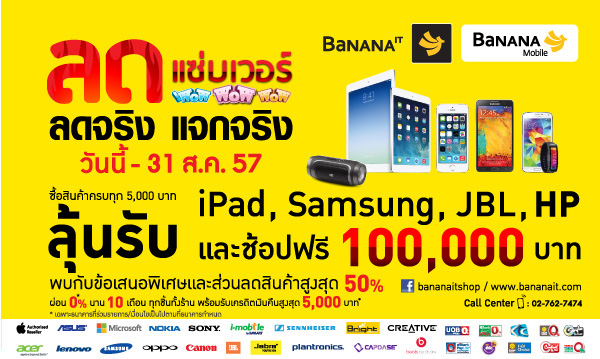 บานาน่าไอที และ บานาน่าโมบาย ชวนคุณมาช้อปสนุก โปรโมชั่นสุดคุ้ม กับสินค้าไอที พร้อมลุ้นโชค 2 ชั้น เมื่อซื้อสินค้าครบทุกๆ 5,000 บาท ลุ้นรับ iPad , Ultrabook Samsung , ลำโพง JBL , พริ้นเตอร์ HP และพลาดไม่ได้ลุ้นช้อปฟรีสูงสุด 100,000 บาท และส่วนลดสินค้าสูงสุด 50% พร้อมแบ่งจ่ายสบายๆ ผ่อนเบาๆ 0% นาน 10 เดือน รับเครดิตเงินคืนสูงสุด 5,000 บาท