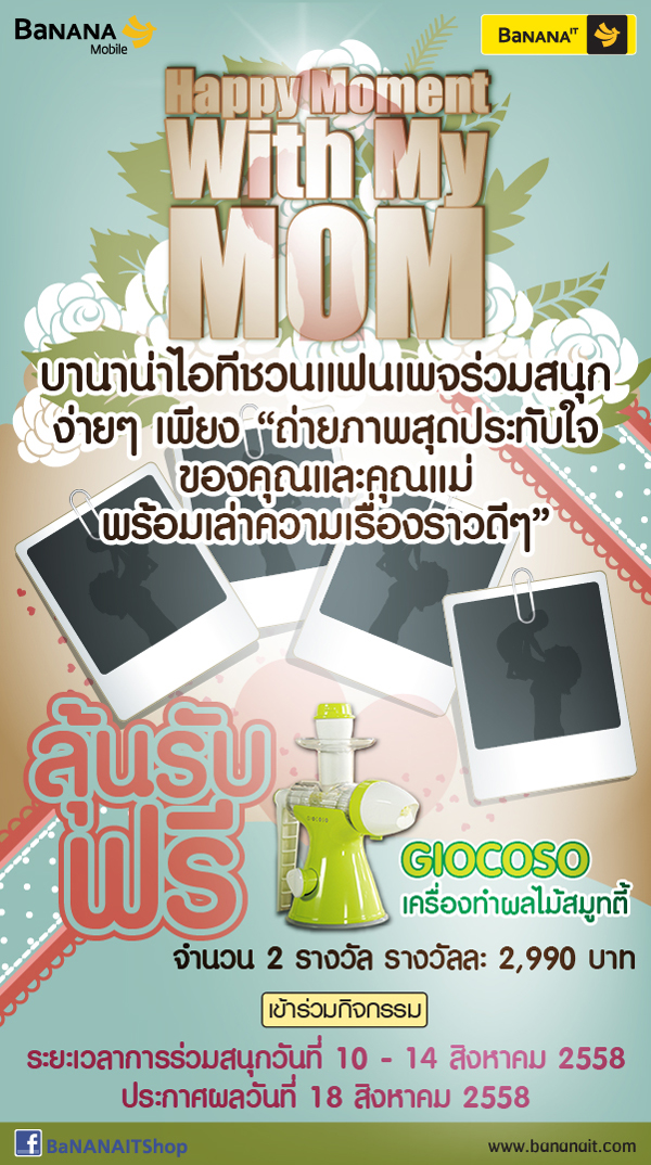 บานาน่าไอทีชวนแฟนเพจร่วมสนุกกับกิจกรรม “Happy Moment With My MOM” ง่ายๆ เพียง "แชร์ภาพกิจกรรม" พร้อม “ถ่ายภาพสุดประทับใจของคุณและคุณแม่ พร้อมเล่าความเรื่องราวดีๆ”