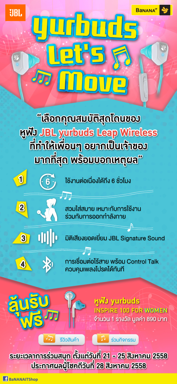 บานาน่าไอทีชวนแฟนเพจร่วมสนุกกับกิจกรรม “yurbuds Let's Move” ง่ายๆ เพียงเลือก "คุณสมบัติสุดโดนของหูฟัง JBL yurbuds Leap Wireless ที่ทำให้เพื่อน ๆ อยากเป็นเจ้าของมากที่สุด พร้อมบอกเหตุผล"