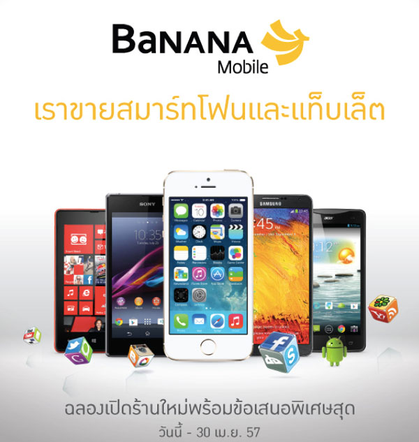 อย่าพลาด!! โอกาสดีๆ ที่คุณจะได้เป็นเจ้าของ สมาร์ทโฟน แท็บเล็ต ในราคาพิเศษ พร้อมของแถมและโปรโมชั่นสุดคุ้ม พร้อมรับประสบการณ์การใช้งานเกิน 100 คุ้มค่ามากกว่าใคร ที่ร้านบานาน่าโมบาย ศูนย์การค้าเซ็นทรัลพลาซ่า พระราม 2 , ศูนย์การค้าเซ็นทรัลพลาซ่า ปิ่นเกล้า, เซ็นทรัลเฟสติวัลสมุย และ ศูนย์การค้าเดอะมอลล์บางกะปิโปรโมชั่นมีตั้งแต่วันนี้ - 30 เมษายน 2557