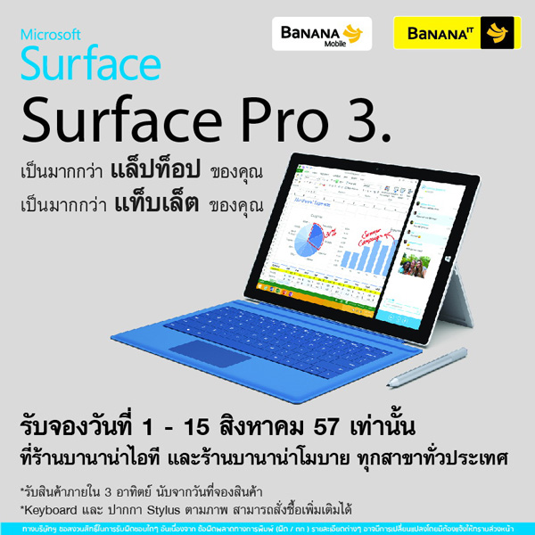 เตรียมพร้อมเป็นเจ้าของ Surface Pro 3 ตอบรับกระแสที่ร้อนแรงกับความสามารถที่เป็นมากกว่าแล็ปท็อปและเป็นมากกว่าแท็บเล็ตของคุณ ที่มีประสิทธิภาพมากขึ้นกว่าเดิม กับ 5 รุ่นที่ร้อนแรง ที่มาพร้อม CPU Intel Core i3 , i5 และ i7 สามารถจองสินค้าก่อนใครได้ที่ร้านบานาน่าไอทีและบานาน่าโมบาย ทุกสาขาทั่วประเทศ ตั้งแต่วันที่ 1-15 สิงหาคม 2557