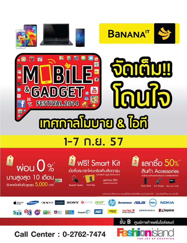บานาน่าไอที พร้อมให้คุณจัดเต็ม ช้อปสนุกโดนใจ กับเทศกาลโมบายและสินค้าไอทีสุดอินเทรนด์ ทันสมัย และเปิดประสบการณ์การใช้งานกับสมาร์ทโฟน แท็บเล็ต กับโปรโมชั่นสุดคุ้ม ผ่อนสบายๆ แบ่งจ่ายเบาๆ 0% นานสูงสุด 10 เดือน และรับเครดิตเงินคืน 5,000 บาท สุดพิเศษ เมื่อซื้อสมาร์ทโฟน แท็บเล็ตรุ่นที่ร่วมรายการ รับฟรี Smart Kit และ สิทธิ์แลกซื้อสินค้า Accessory ลดสูงสุด 50% พบกันได้ที่งาน BaNANA IT Mobile&Gadget Festival 2014