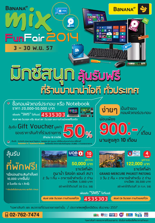 บานาน่าไอที ให้คุณ มิกซ์ความสนุก ลุ้นช้อปฟรี พร้อมโปรโมชั่นสุดโดน อาทิ ลุ้นรับ Gift Voucher มูลค่าสูงสุด 25,000 บาท เมื่อซื้อคอมพิวเตอร์ประกอบและโน๊ตบุ๊ค, ลุ้นที่พักฟรี เมื่อผ่อนชำระด้วยบัตรเครดิต UOB, Citibank มูลค่า 10,000 บาท ขึ้นไป, รับส่วนลด 50% แลกซื้อ Accessory เมื่อซื้อเครื่องคอมพิวเตอร์ประกอบ, คอมพิวเตอร์ประกอบลดสูงสุด 2,000 บาท, ฟรี USB Sandisk 16 GB เมื่อซื้อโน๊ตบุ๊ค ทุกรุ่น พร้อมผ่อนสบายๆ เบาๆ 0% นานสูงสุด 10 เดือน ที่ร้านบานาน่าไอที ทุกสาขาทั่วประเทศ วันที่ 3 – 30 พฤศจิกายน 2557