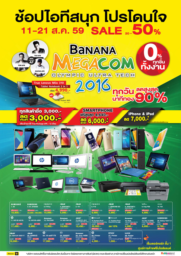 บานาน่าสโตร์ ชวนคุณลูกค้ามางาน “BaNANA MEGACOM OLYMPIC ULTRA TECH 2016″ ช้อปสินค้าไอทีราคาสุดพิเศษ พร้อมโปรโมชั่นสินค้านาทีทอง ลดสูงสุด 90% เเละยังมีกิจกรรมร่วมสนุกมากมาย อาทิ Mini Concert กับคชา, ต้น, เต๋า AF8,บานาน่า Kids Zone, ประมูลสินค้า เริ่มต้น 1 บาท, ซื้อ Popcorn ร่วมสร้างห้องคอมของหนู