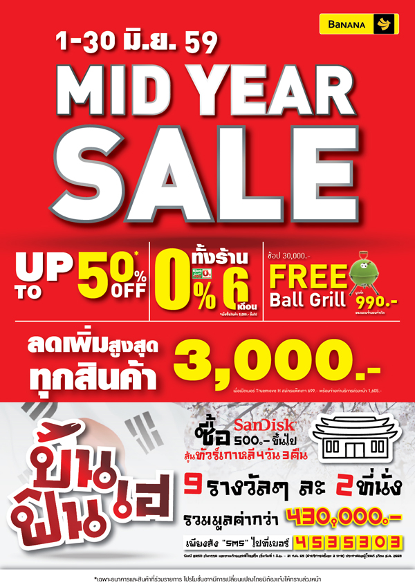 บานาน่า ผู้นำร้านค้าปลีกสินค้าไอที 170 สาขาทั่วประเทศ จัดโปรโมชั่น “Mid Year Sale” ลดจัดเต็มทุกสาขาทั่วประเทศ สินค้าไอทีแบรนด์ดังลดสูงสุด 50% พร้อมรับส่วนลดเพิ่มสูงสุด 3,000 บาททุกสินค้า และผ่อนสบาย 0% นาน 6 เดือน ทุกชิ้นทั้งร้านพร้อมรับฟรี Ball Grill มูลค่า 990 บาทนอกจากนี้ซื้อสินค้า SanDisk ที่ร้านร่วมลุ้นเที่ยวประเทศเกาหลี 4 วัน 3 คืน รวมมูลค่ากว่า 430,000 บาท