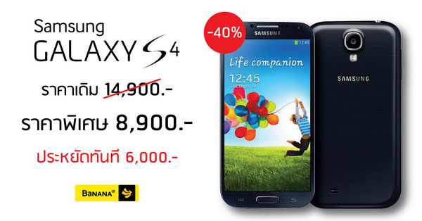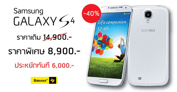 โปรโมชั่นพิเศษสุด ช้อปออนไลน์กับบานาน่าไอที ลดทันที 6,000 บาท กับสมาร์ทโฟน Samsung Galaxy S4 16GB (สีขาว/ดำ) เหลือเพียง 8,900 บาท จากราคาปกติ 14,900 บาท เครื่องใหม่ ประกันศูนย์ 1 ปี สินค้ามีจำนวนจำกัด อย่าพลาดโอกาสพิเศษนี้