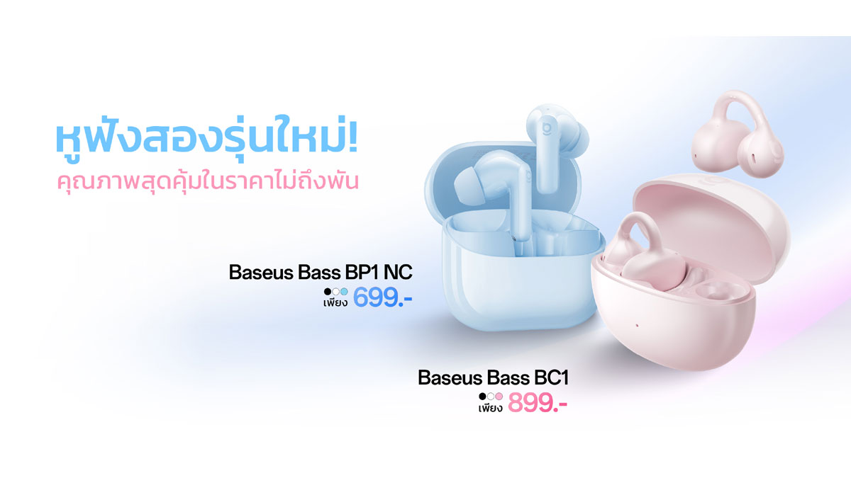 ห้ามพลาด! สัมผัสคุณภาพเสียงสุดว้าวของ Baseus Bass BP1 NC เสียงดีมี ANC เพียง 699 บาท และ Baseus Bass BC1 ดีไซน์เกี่ยวหูเท่อินเทรนด์ เพียง 899 บาท ได้แล้ววันนี้ ผ่านช่องทางออนไลน์ LAZADA, Shopee และ TikTok พร้อมส่วนลดสุดพิเศษอีกมากมาย