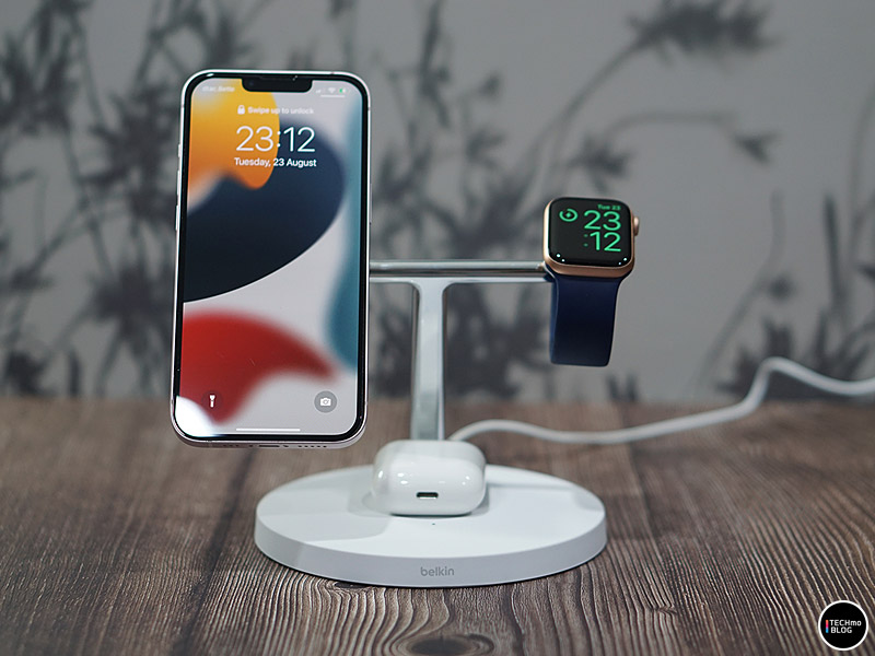 ดีไซน์ของแท่นชาร์จไร้สาย Belkin BOOST↑CHARGE PRO 3-in-1 จะเป็นสไตล์มินิมอล เข้ากันได้กับโต๊ะทำงาน และสามารถใช้เป็นของแต่งบ้านได้ในตัว โดยแท่นชาร์จไร้สายรุ่นนี้ มาพร้อมกับเทคโนโลยี MagSafe ชาร์จ iPhone 12 และ iPhone 13 ได้สะดวกขึ้นแค่วาง iPhone บนแท่นชาร์จ แม่เหล็กที่อยู่ด้านในจะช่วยจัดวางตำแหน่งให้ลงล็อคได้พอดี
