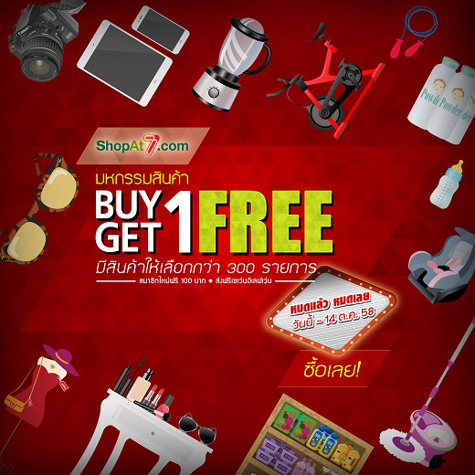 Shopat7.com ส่งโปรฯประหยัดจัดเต็ม Buy 1 Get 1 FREE สินค้ากว่า 300 รายการ ทั้งลดทั้งแถม ให้ลูกค้าได้ช้อปแบบเซฟสุดๆ เช่น ซอฟต์แวร์ Bitdefender รุ่น Total Security 2015 ซื้อ 1 แถม 1 ราคาพิเศษ 999 บาท นาฬิกา Casio รุ่น F200W-9A ซื้อ 1 แถม 1 ราคาพิเศษ 699 บาท และสินค้าอื่นๆอีกเพียบ ด่วน หมดแล้วหมดเลย วันนี้ ถึง 14 ต.ค. 58 เท่านั้น