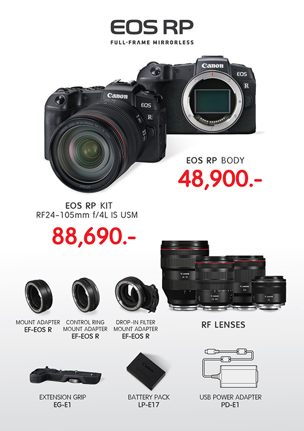 ทั้งนี้ แคนนอนจัดงานเปิดตัว Canon EOS RP มิเรอร์เลสฟูลเฟรมล่าสุด พร้อมเผยในราคาตัวกล้อง 48,900 บาท และตัวกล้องพร้อมเลนส์ RF 24-105L ราคา 88,690 บาท โดย Canon EOS RP จะเริ่มวางจำหน่ายต้นเดือนมีนาคมเป็นต้นไป สามารถสอบถามข้อมูลเพิ่มเติมได้ที่ 0-2344-9988 เว็บไซต์ www.cannon.co.th หรือ facebook.com/canon.thailand