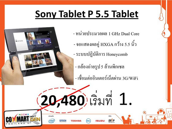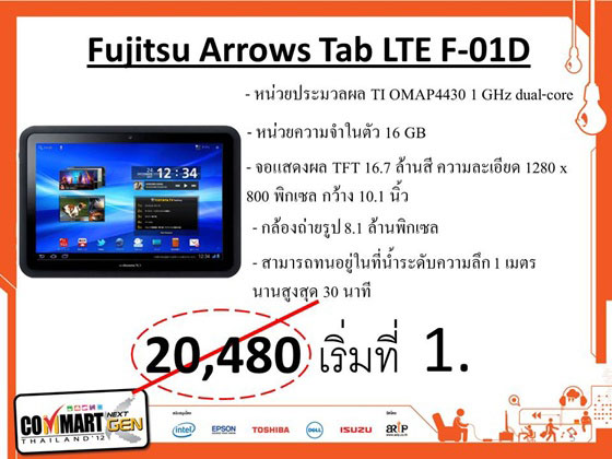 [9-มิถุนายน-2555] เป็นประจำเหมือนเช่นเคยครับ ในวันสุดท้ายของงาน Commart Next Gen 2012 จะมีประมูลสินค้า เริ่มต้นที่ 1 บาทครับ ซึ่งสินค้าในหมวดของแท็บเล็ต (Tablet) ที่เข้าร่วมการประมูลในครั้งนี้ มีถึง 3 รุ่นด้วยกัน ได้แก่ Sony Tablet P แท็บเล็ตหน้าจอ 5.5 นิ้ว, Fujitsu Arrow Tab LTE F-01D และ aigo PAD M801 ครับ นอกจากนี้ ยังมีโน๊ตบุ๊ตจาก MSI อีก 1 รุ่น รวมไปถึงอุปกรณ์ไอทีอื่นๆ เช่น Talking dict, นาฬิกา เป็นต้น รายละเอียดตามภาพครับ