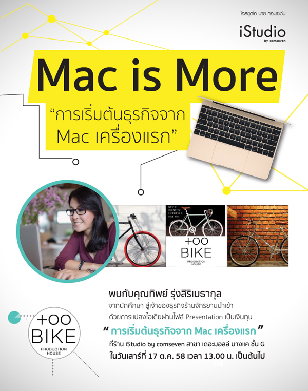 iStudio by comseven สาขา เดอะมอลล์ บางแค ชวนคุณมาร่วมกิจกรรม "Mac is More" สร้างความสำเร็จให้กับธุรกิจของคุณได้ง่าย ๆ ด้วย Mac เพียงเครื่องเดียว ร่วมพูดคุยกับ คุณทิพย์ รุ่งสิริเมธากุล เจ้าของธุรกิจนำเข้าจักรยาน "Too Bike Production House" ในวันเสาร์ที่ 17 ตุลาคมนี้ เวลา 13.00 น. เป็นต้นไป ที่ iStudio by comseven สาขา เดอะมอลล์ บางแค