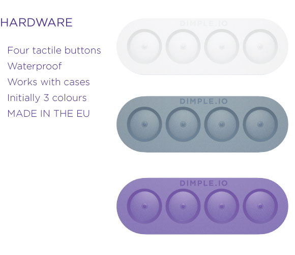 โดย Dimple จะมีลักษณะเป็นแผงปุ่มกดแบบสัมผัส ขนาดไม่ใหญ่ และบาง สามารถแปะไว้ที่ตำแหน่งใดก็ได้บน สมาร์ทโฟน กับ แท็บเล็ต นอกจากนี้ ยังมีคุณสมบัติในการกันน้ำ, สามารถใช้งานร่วมกับเคสได้ และมีให้เลือก 3 สี ได้แก่ สีขาว, สีเทา และ สีม่วงครับ